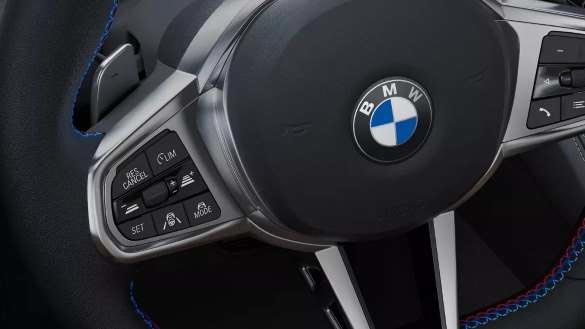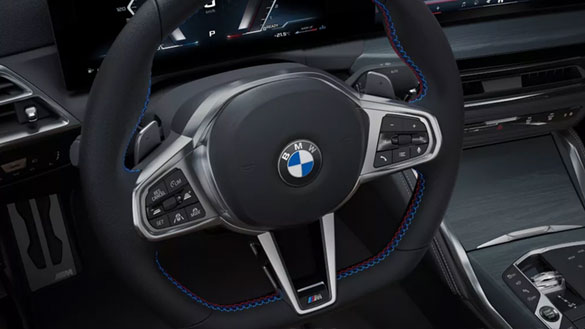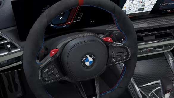 Spłaszczona u dołu kierownica skórzana M, wyposażona w ukształtowane wgłębienia na kciuki, zapewnia pewny i komfortowy chwyt, co przekłada się na lepszą kontrolę nad pojazdem. Oznaczenie na godzinie 12:00 oraz emblemat M dodatkowo podkreślają sportowy charakter i przynależność do BMW M.