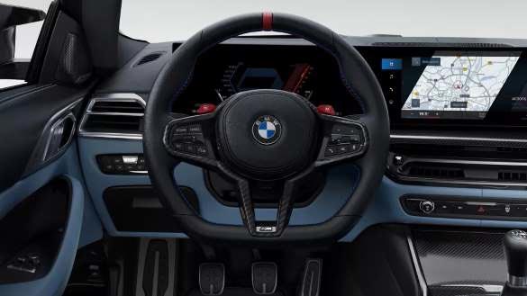 Kierownica M obszyta alcantarą zapewnia pewny i komfortowy chwyt, a czerwone oznaczenie na godzinie 12:00, emblemat M oraz kontrastowe szwy w kolorach M podkreślają wyścigowy charakter wnętrza, przynosząc uczucie bycia blisko toru nawet podczas codziennej jazdy.